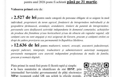Compania Naţională de Asigurări în Medicină informează despre achitarea primei de asigurare medicală obligatorie în sumă fixă pentru anul 2026. 𝟎𝟏 𝐢𝐚𝐧𝐮𝐚𝐫𝐢𝐞 – 𝟑𝟏 𝐦𝐚𝐫𝐭𝐢𝐞 𝟐𝟎𝟐𝟔 𝐏𝐫𝐢𝐦𝐚 𝐢𝐧𝐭𝐞𝐠𝐫𝐚𝐥𝐚̆: 𝟏𝟐 𝟔𝟑𝟔 𝐥𝐞𝐢 Facilități în primele 3 luni: 𝟐 𝟓𝟐𝟕 𝐥𝐞𝐢 – 𝐩𝐫𝐨𝐩𝐫𝐢𝐞𝐭𝐚𝐫𝐢 𝐝𝐞 𝐭𝐞𝐫𝐞𝐧𝐮𝐫𝐢 𝐚𝐠𝐫𝐢𝐜𝐨𝐥𝐞, 𝐟𝐨𝐧𝐝𝐚𝐭𝐨𝐫𝐢 […]